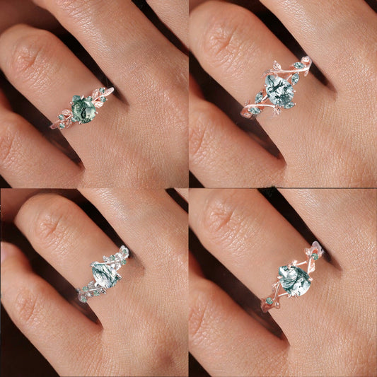 Pear shaped Moss Agate Engagement Promise Ring Leaf Nature Inspired Bridal Set