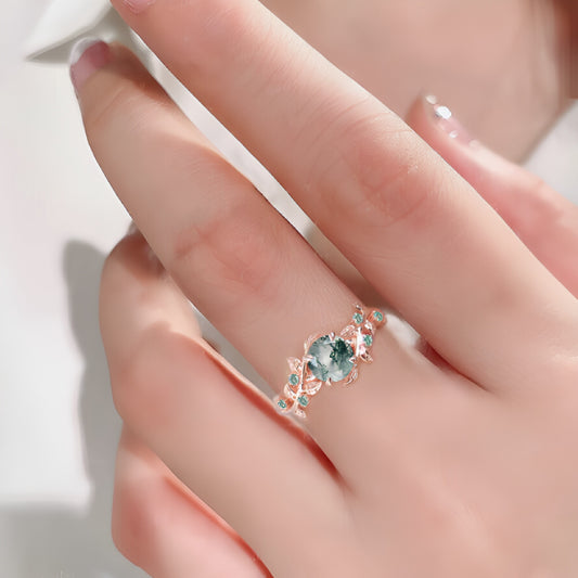 Nature Inspired Kite Cut Moss Agate Promise Ring Emerald Foliage Ring