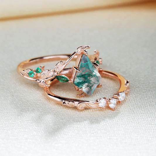 Kite Cut Moss Agate Bridal Ring Set Nature Inspired Leaf Ring Set