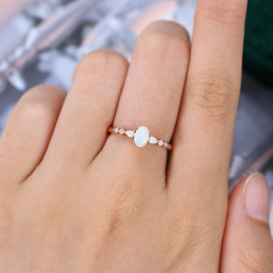 Oval Opal Trio Side Stones Engagement Ring Dainty Promise Ring