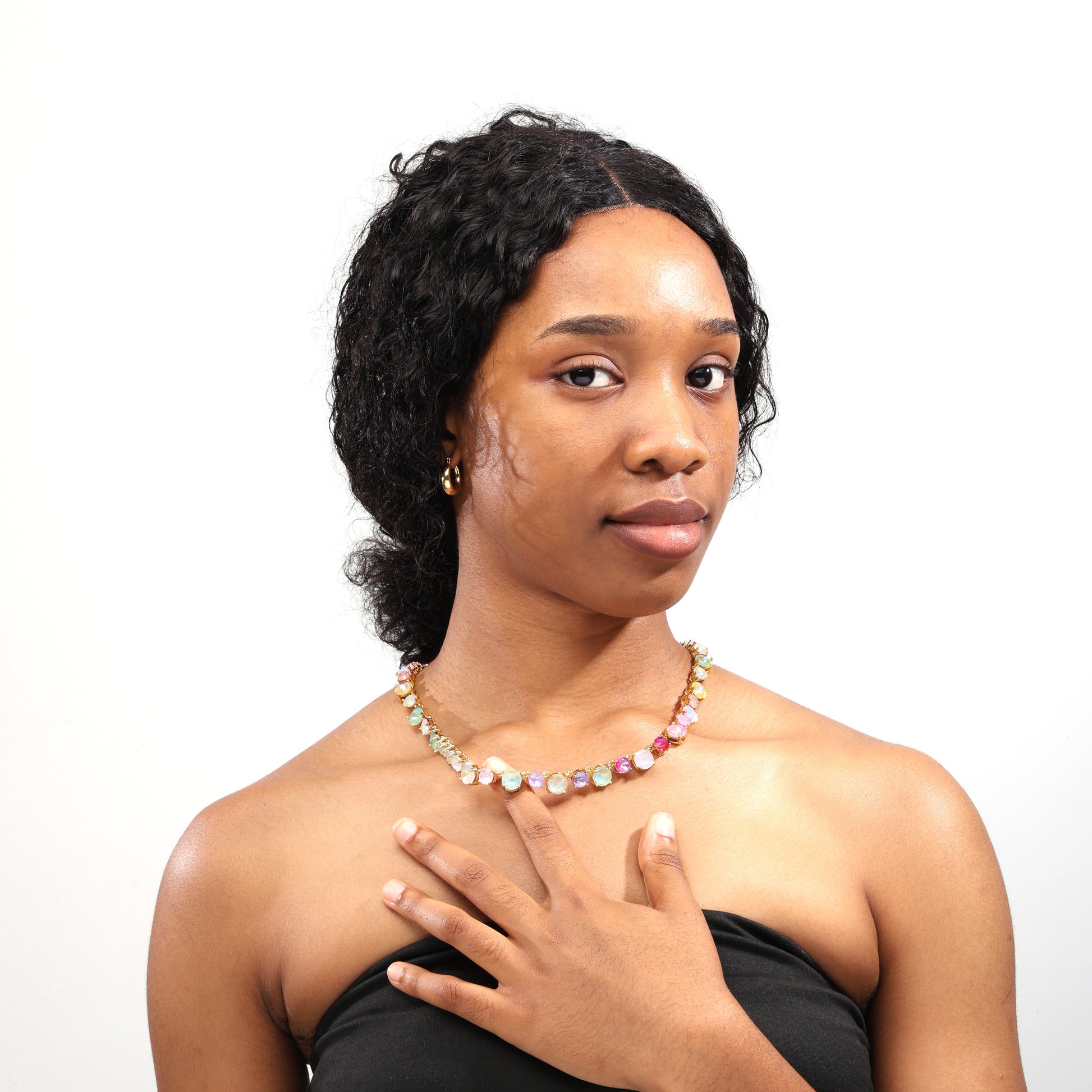 Embrace a world of pure, playful romance with this adorable necklace featuring a confetti of pastel zircon gemstones (sparkling joy) and a charming, candy-colored design (whimsical delight).