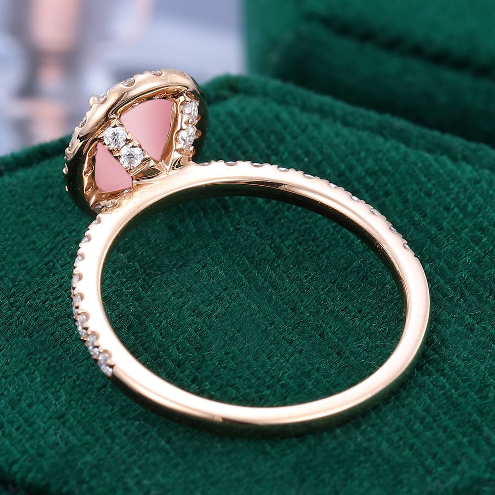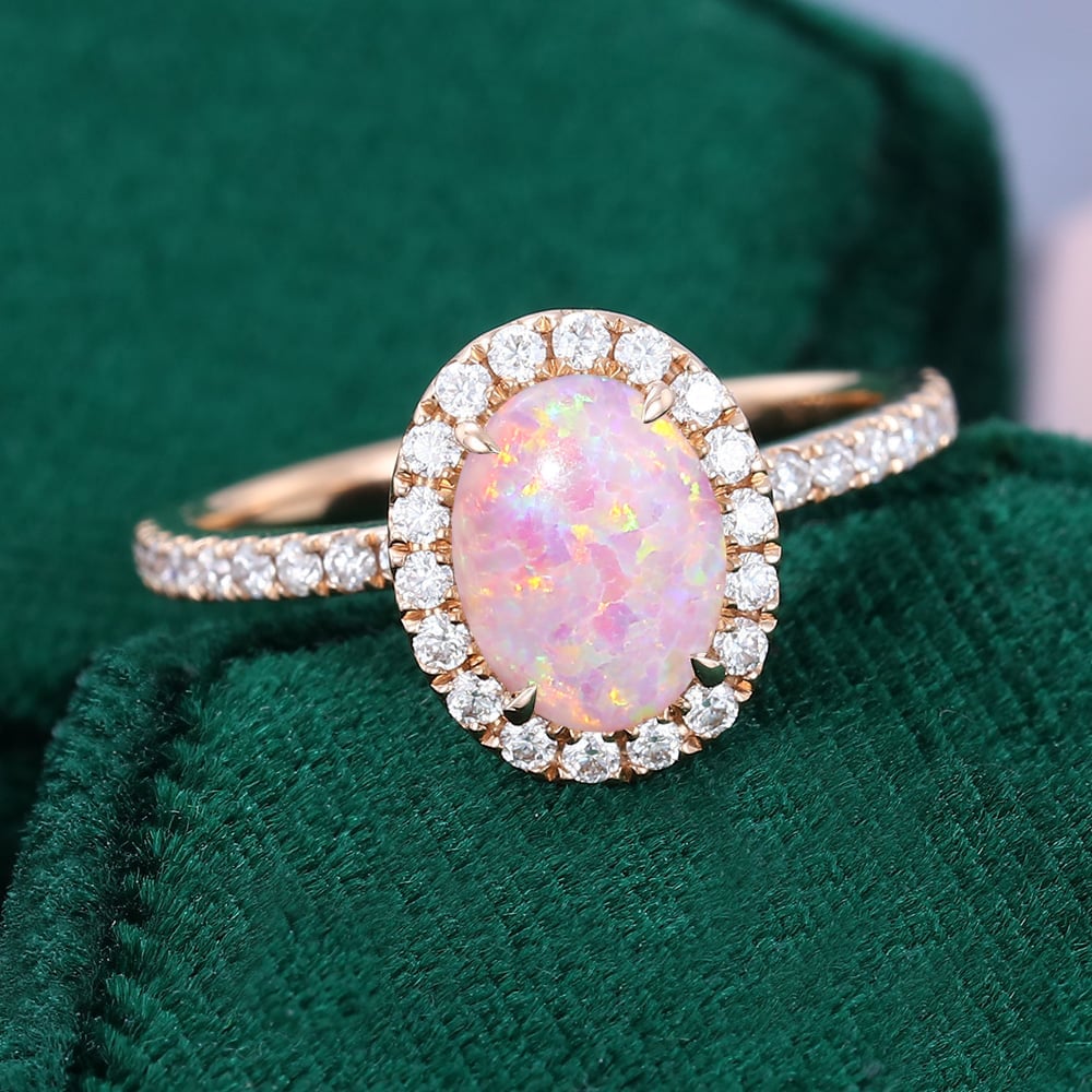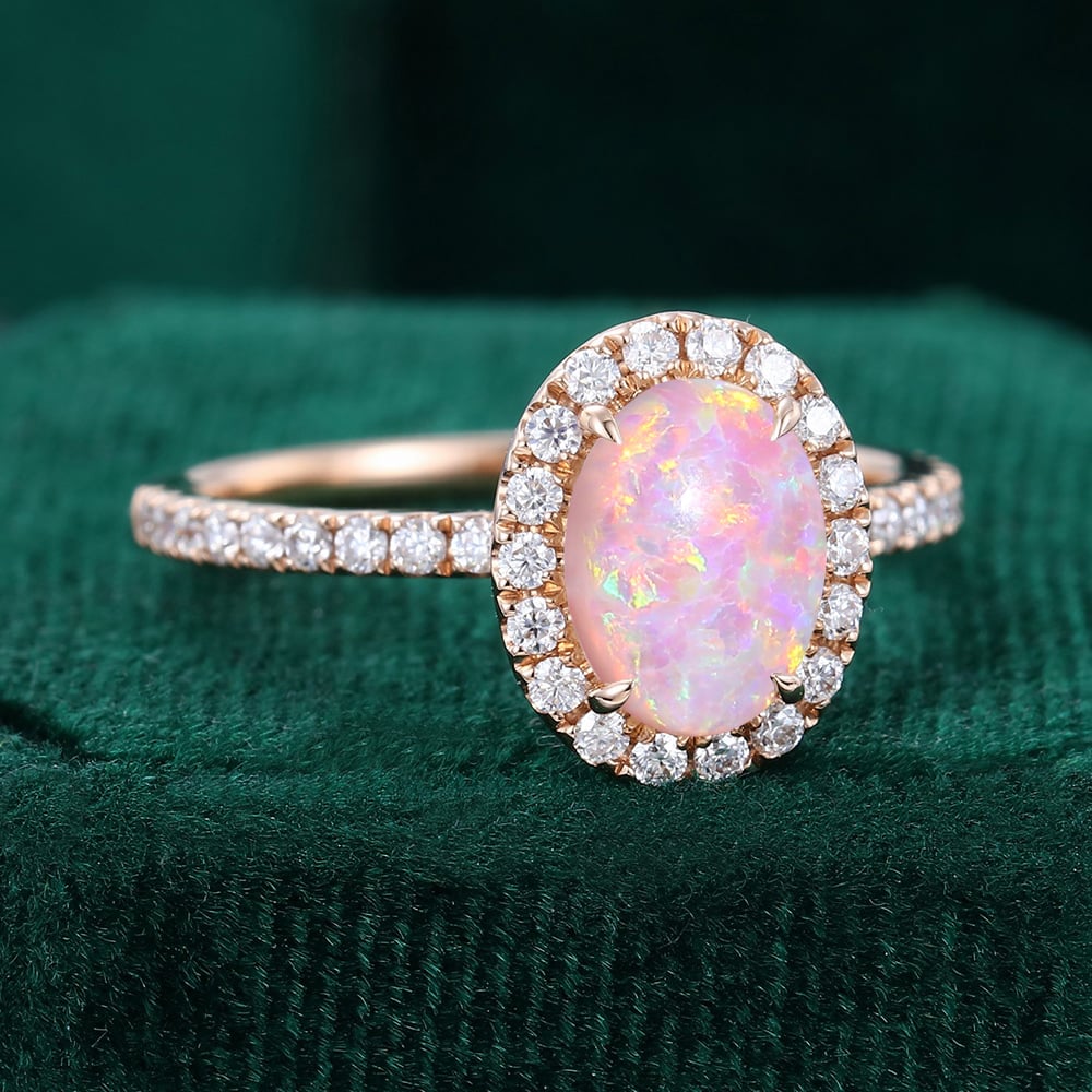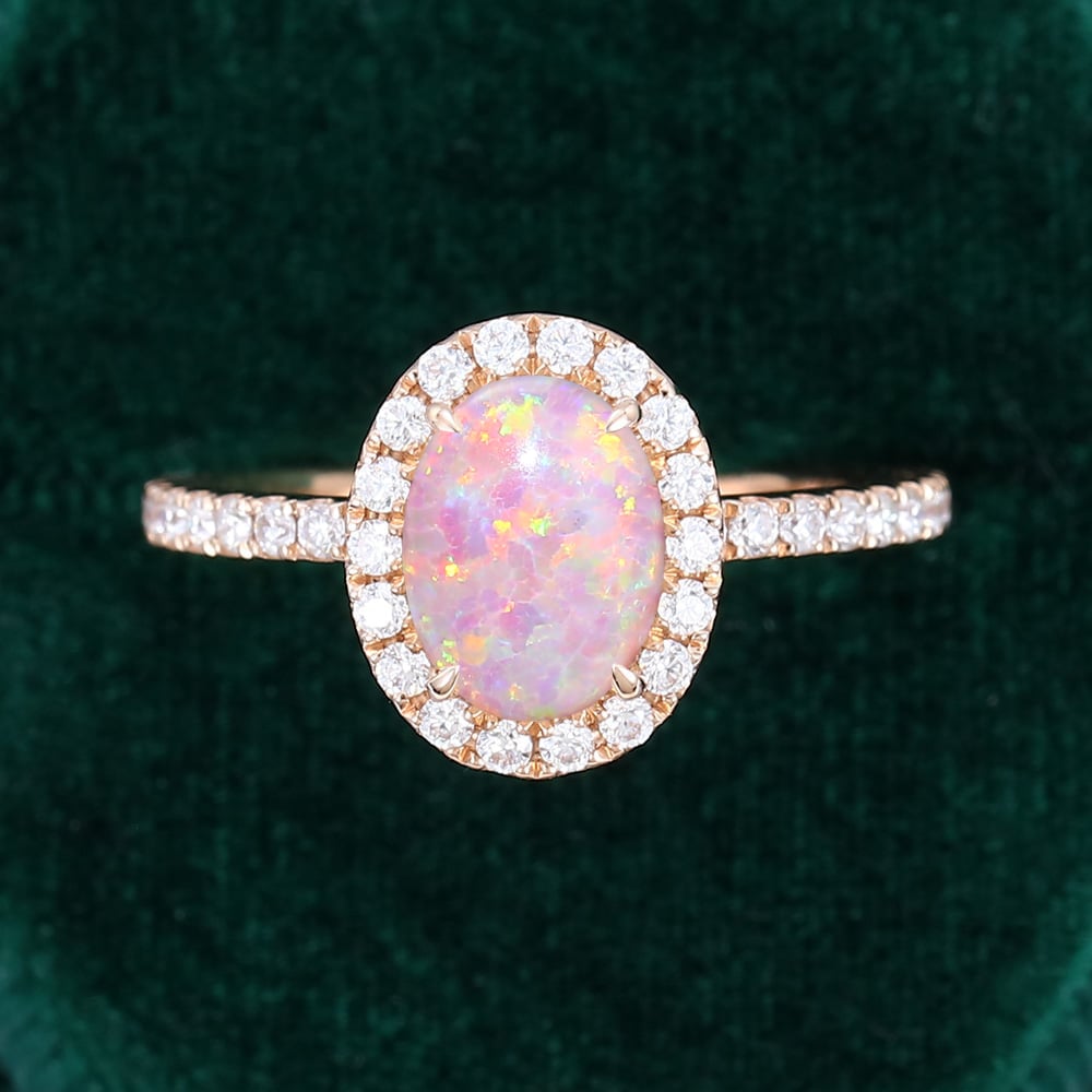 Oval Cut Lab Pink Opal Engagement Ring Moissanite Halo Accented Pavé Ring